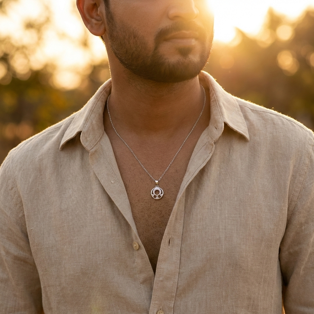 Its clean geometry and subtle sparkle make it a versatile statement — understated enough for daily wear, yet distinctive enough to elevate evening and formal looks. Designed for men who appreciate meaning, craftsmanship, and quiet confidence, this pendant reflects strength without excess.