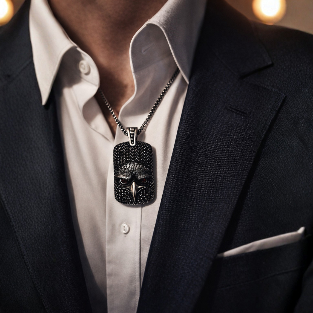 Set against a deep black, diamond-dust texture, the eagle’s piercing gaze is brought to life with subtle red accents, creating a dramatic contrast that radiates authority and sophistication. Finished with a premium rhodium coating, this pendant delivers a dark, masculine brilliance that elevates both formal and casual attire.