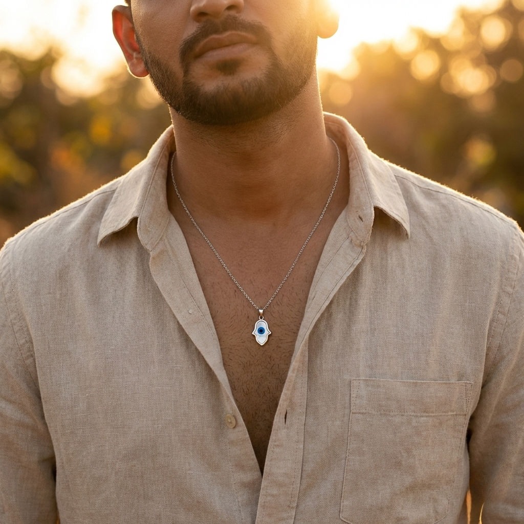 The Sentinel Eye Pendant is designed for men who stay grounded, protect their space, and move forward with intention. The pearl surface reflects calm and balance, while the blue eye stands alert — a reminder to stay focused and unaffected by distractions.