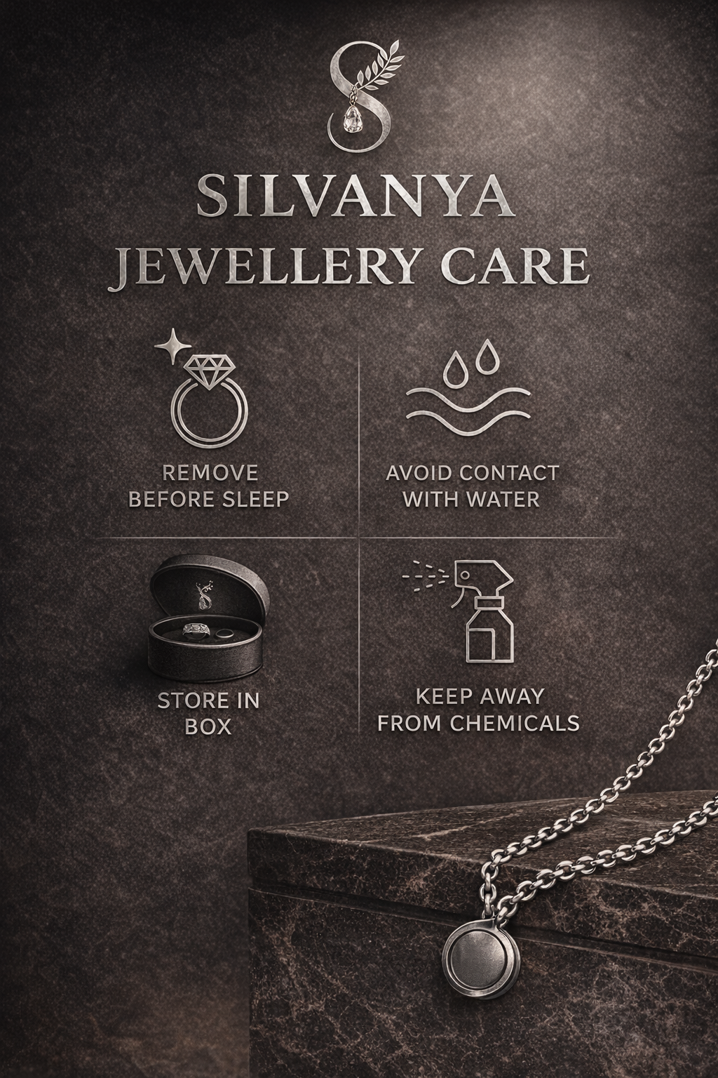 Avoid direct contact with perfumes, lotions, and harsh chemicals to prevent tarnishing and damage.