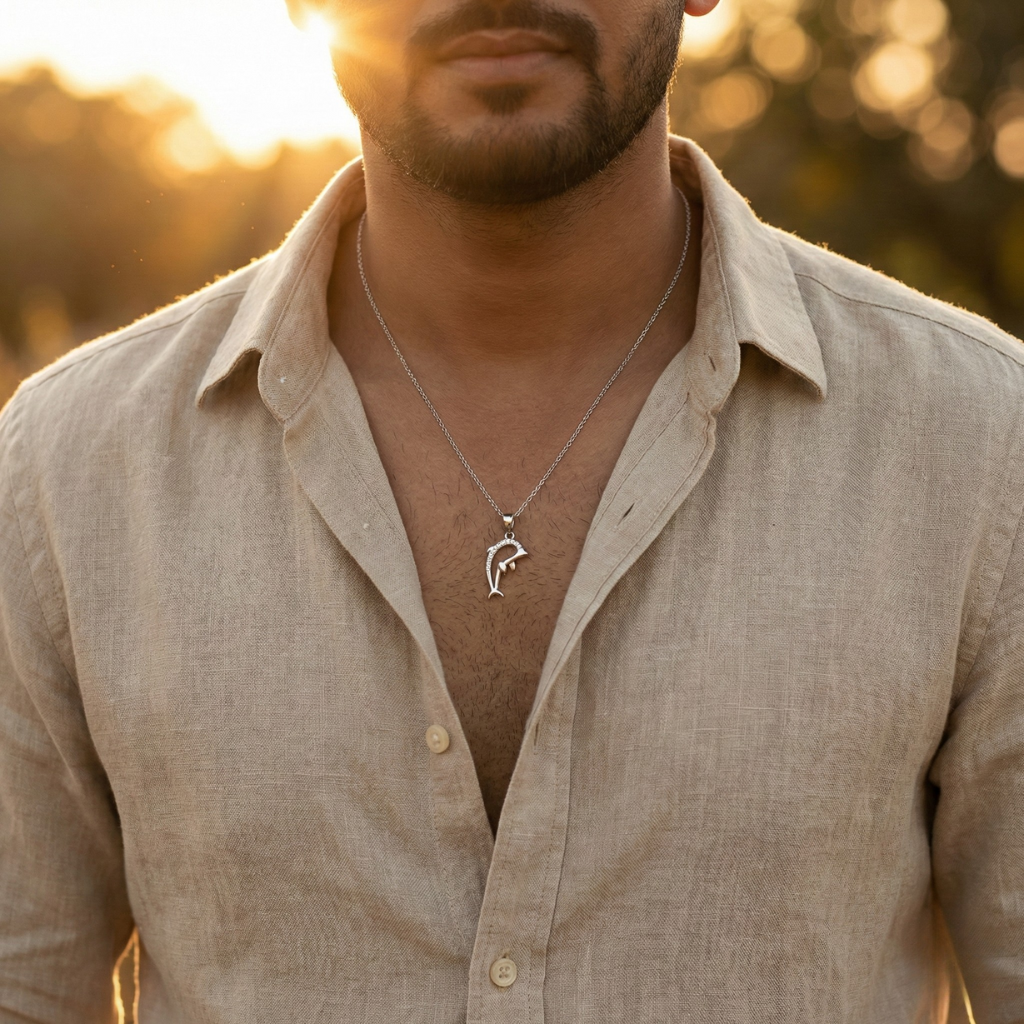 Accented with subtle Cubic Zirconia detailing along the dolphin’s curve, the design balances masculine minimalism with understated luxury. Its clean lines and polished silver finish make it an ideal everyday pendant for men, while its symbolism and elegance allow it to transition seamlessly into unisex styling.