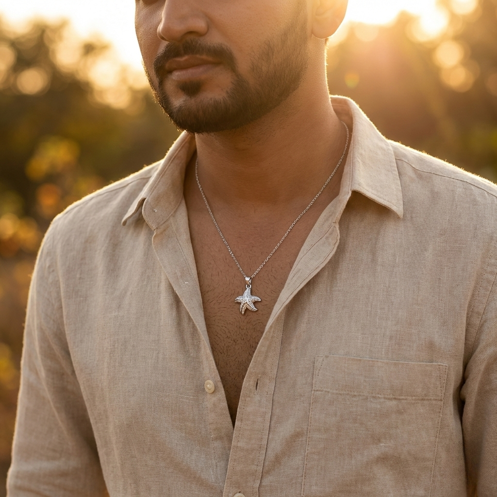 The Starfish Strength Pendant by Silvanya reinterprets ocean symbolism through a bold yet refined masculine design. Crafted in 92.5% pure sterling silver, this pendant features a structured starfish form detailed with precisely set Cubic Zirconia stones — representing resilience, regeneration, and quiet confidence.